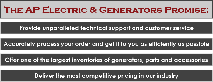 AP Electric & Generators was founded in 1999 in the suburbs of Chicago and has earned an A+ rating from the Better Business Bureau (BBB). We started as electricians focused on selling, installing and servicing home standby generators and backup power solutions in the Chicago area. In 2005 we became the pioneers of internet sales in our industry. Since that time, we have grown to be one of the largest on-line distributors of backup power generators in the country. We have successfully served over 100,000 customers since the internet sales opened in 2005.