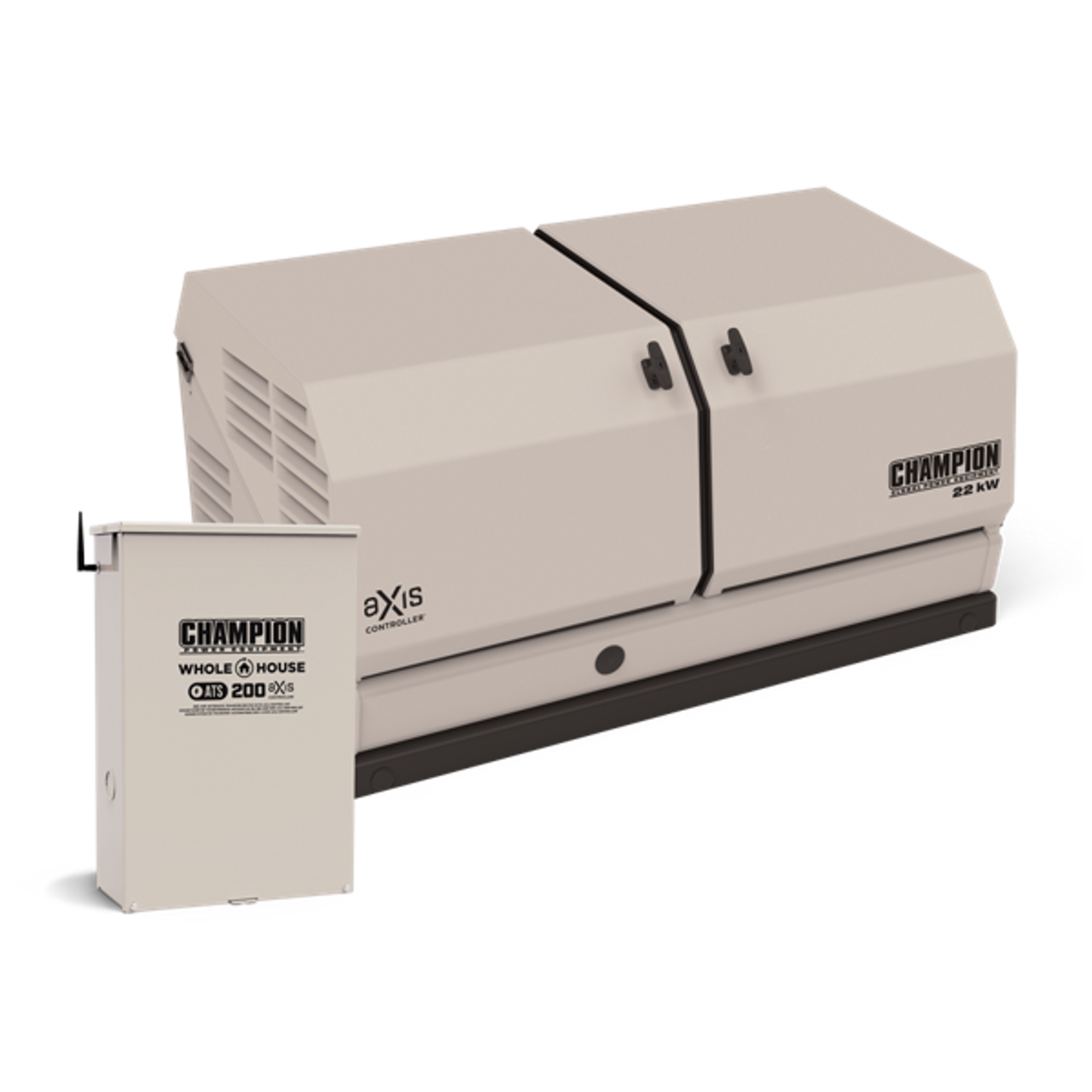 The Champion Power Equipment 201222 Home Standby Generator System includes 22 kW aXis Home Standby Generator and 200A aXis ATS Whole House Automatic Transfer Switch. Equipped with aXis technology for reduced costs, increases efficiency, and peace of mind while ensuring security and convenience for your family during an emergency. Enjoy totally automatic, seamless power to your home during an outage.